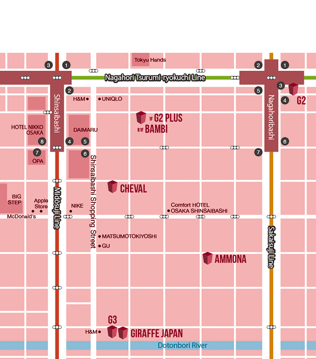 緊鄰於GIRAFFE JAPAN的G2姐妹店:CLUB G3!在大阪熱鬧的南區中心地向大家呈現嶄新的夜店文化!女性每天都可免費入場!融合了世界各地的無國籍音樂空間:G3!